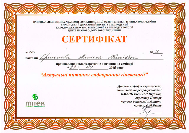 Лікар акушер - гінеколог вищої кваліфікаційної категорії з досвідом роботи більше 20 років, гінеколог-ендокринолог, дитячий гінеколог, мамолог, УЗД - фахівець, фахівець лазерних технологій в гінекології.