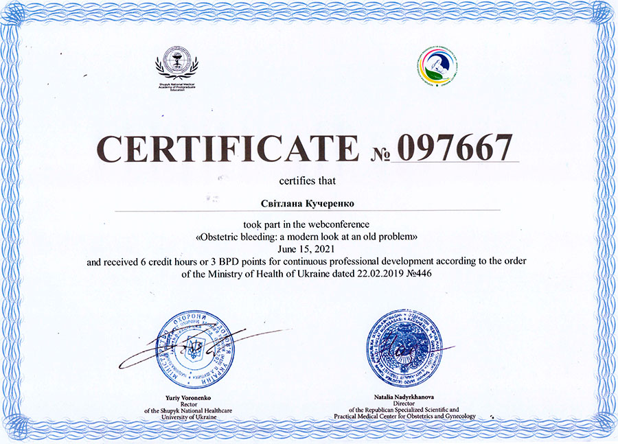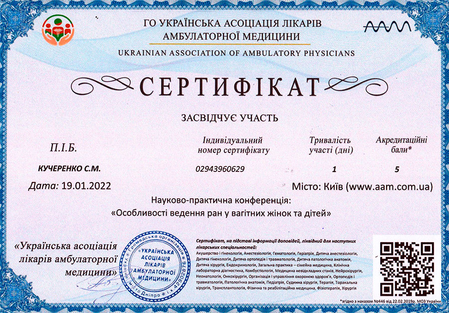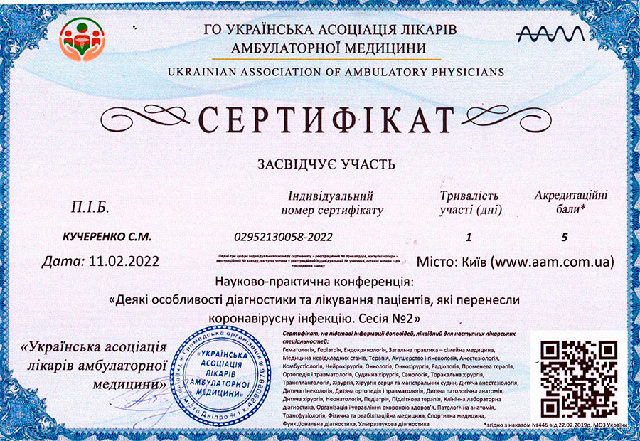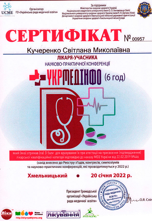 Кучеренко Світлана Миколаївна (стаж за спеціальністю – 35 років), лікар вищої категорії, кандидат медичних наук.