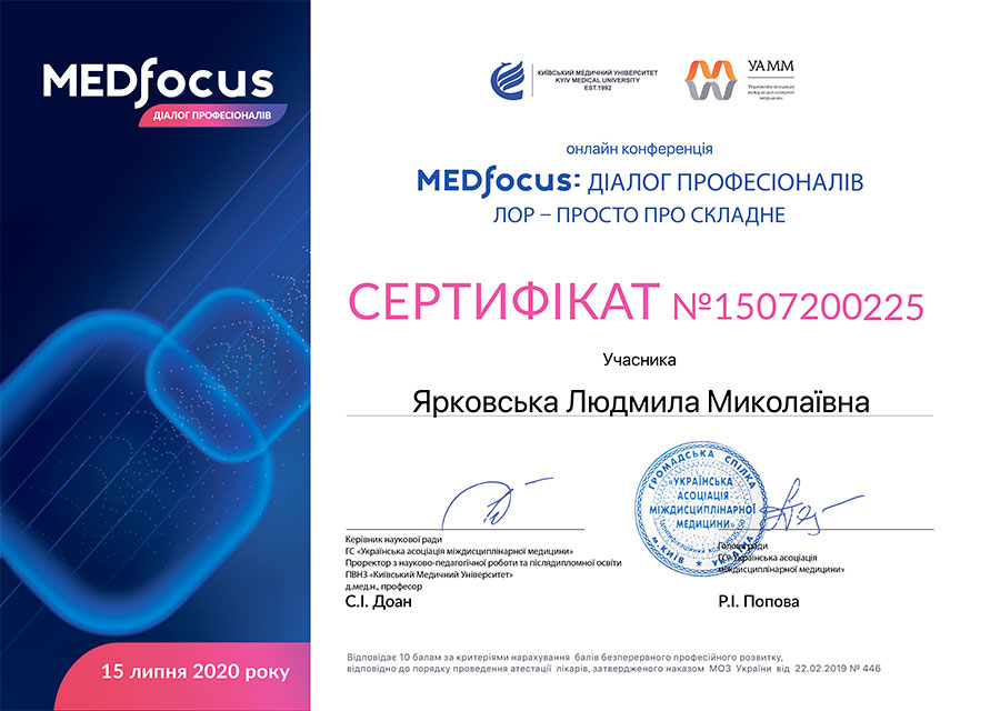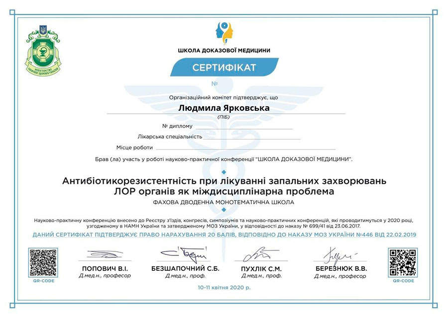 - Всеукраїнська професійна школа респіраторної медицини, школа доказової медицини (алергічний риніт в практиці отоларинголога);